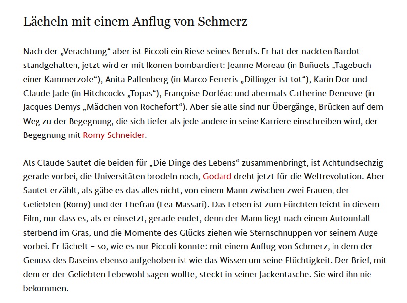 Heute wurde bekannt, dass er am 12. Mai starb: Michel Piccoli, den man den größten europäischen Filmschauspieler nennen darf. Er war ein monstre sacrée, er vereinte Eleganz und Wurstigkeit, Sex-Appeal und Monstrosität. Er hatte großen Mut zu Entblößung und Verwandlung und Heroisches war im fremd. Filmriktiker Michael Althen schrieb einmal: „Er war sich für nichts zu schade. Man wäre versucht zu sagen, dass er dabei immer sein Gesicht gewahrt hat, wenn man nicht wüsste, dass er vielleicht nichts so sehr wollte wie sein Gesicht zu verlieren.“