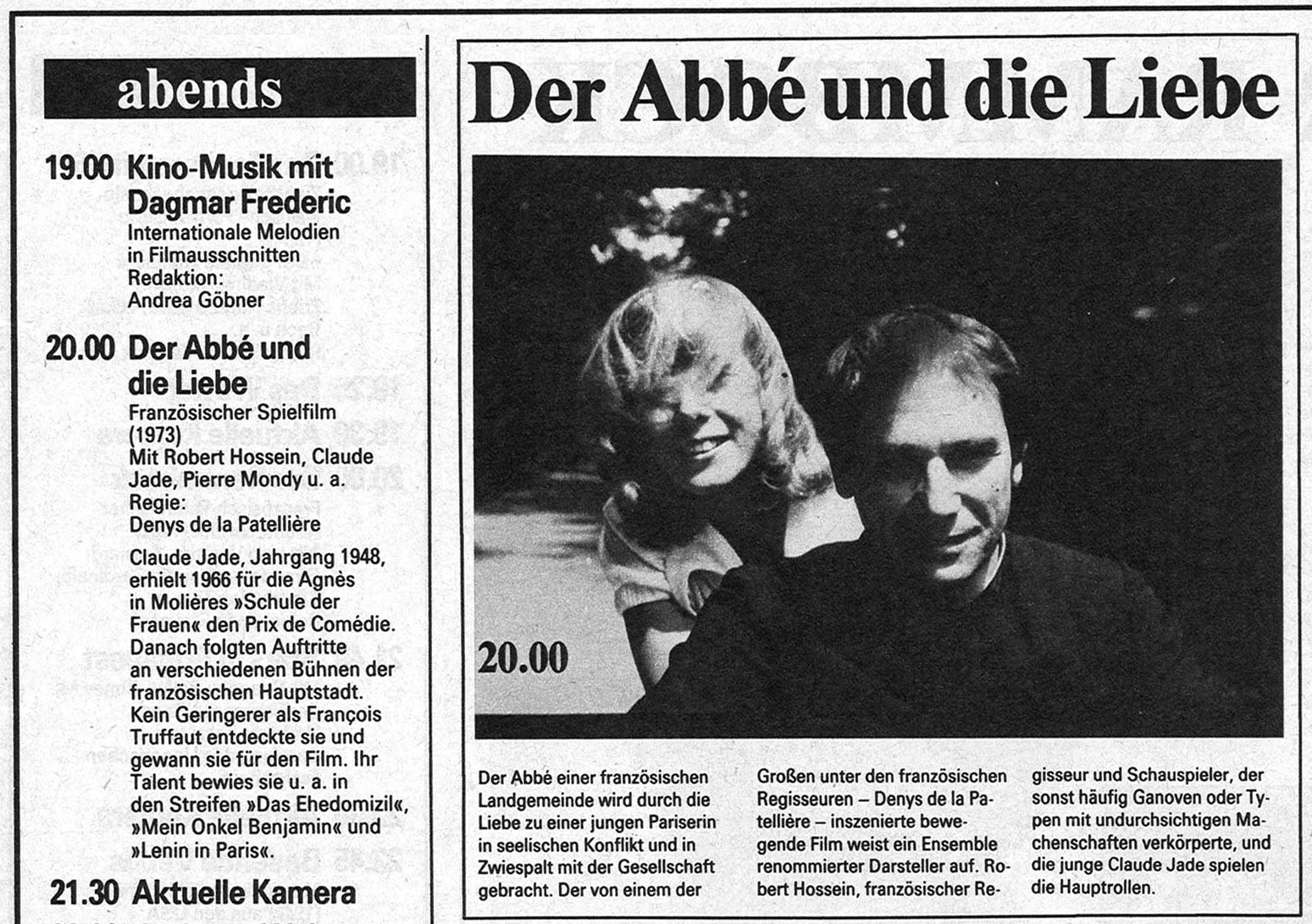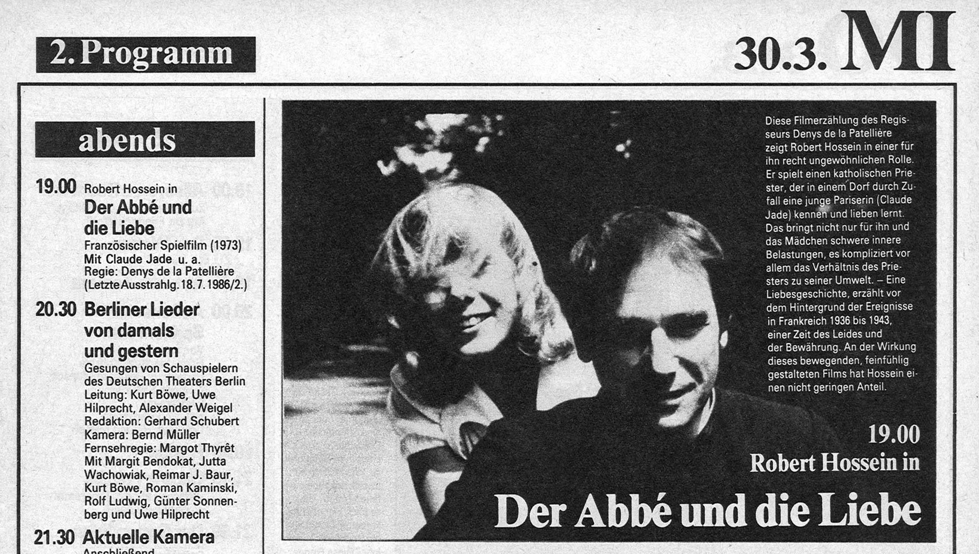 „Prêtres interdits“ erzählt sie Geschichte eines ungewöhnlichen Liebespaares. Die junge Pariserin Françoise verliebt sich 1936 auf dem Lande in den Priester Jean. Nach anfänglichem Zögern erwidert er ihre Gefühle. Als Françoise ein Kind erwartet, wird Jean suspendiert und geht in die Résistance… Der Priester stellt eine Ausnahme in Robert Hosseins Rollenspektrum dar. Der Film lief im deutschen Fernsehen erstmals 1986 und dann 1988 in einer Mittwoch-Filmreihe zu Ehren Robert Hosseins. Die Kinozeotschrift Filmspiegel schrieb 1986 zur Erstaufführung: „Diesen Abbé spielt Robert Hossein, Regisseur und Schauspieler, der so häufig den miesen Ganoven, den brutalen Draufgänger verkörpert hat. Hier ist es eine Rolle, die ihm die Darstellung menschlicher Größe und glaubhafter Gefühle abverlangt. Seine Partnerin ist Claude Jade – die 26jährige wirkt wie ein gerade 16jähriges Schulmädchen.“