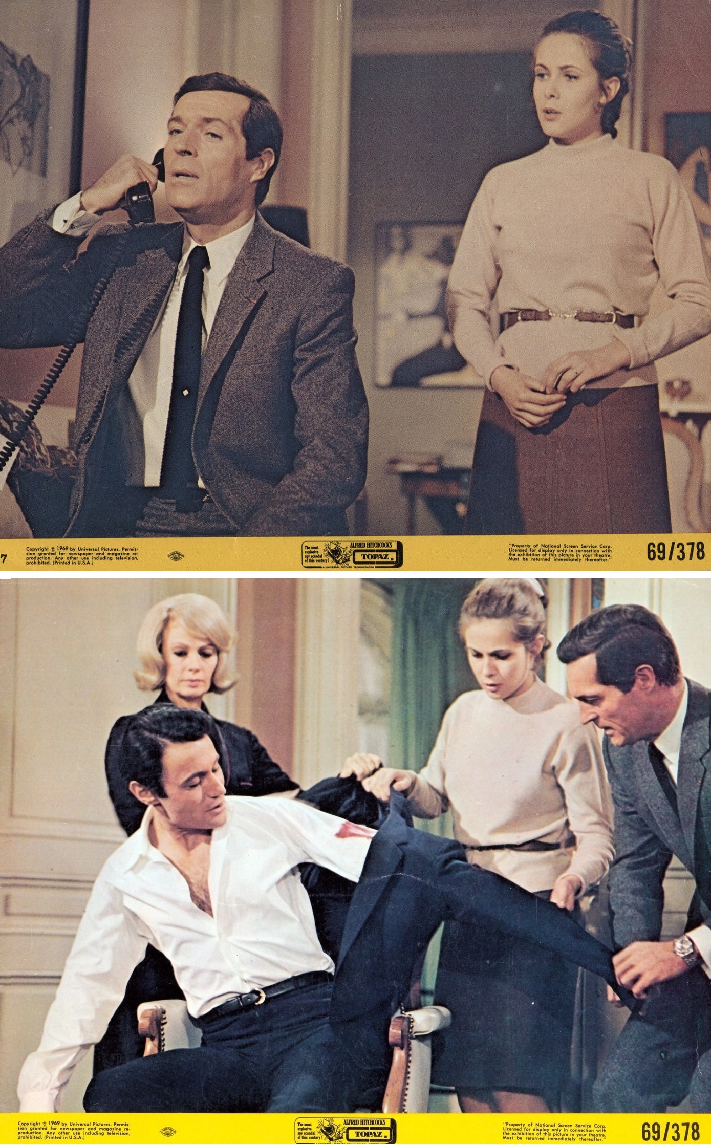 Frederick Stafford hat in Frankreich eine gewisse Popularität, als Hitchcock einen geeigneten Star für „Topas“ sucht. Nachdem er bei „Torn Curtain“ mit Paul Newman und Julie Andrews unglücklich war, wollte er keine Top-Stars mehr, wie es zuvor James Stewart und Cary Grant waren. Claude Jade hatte nach ihrem Debut in Truffauts „Baisers volés“ bereits mit Staffords Entdecker André Hunebelle „Sous le signe de Monte Cristo“ gedreht, ihre französischen Kollegen Dany Robin, Michel Subor, Michel Piccoli und Philippe Noiret genossen bereits Ansehen und auch die weiteren Hauptdarsteller waren keine Unbekannten: die deutsche Krimiheldin Karin Dor war gerade ein Bond-Girl und John Forsythe hatte nach Hitchcocks „The Trouble with Harry“ eine solide Karriere.