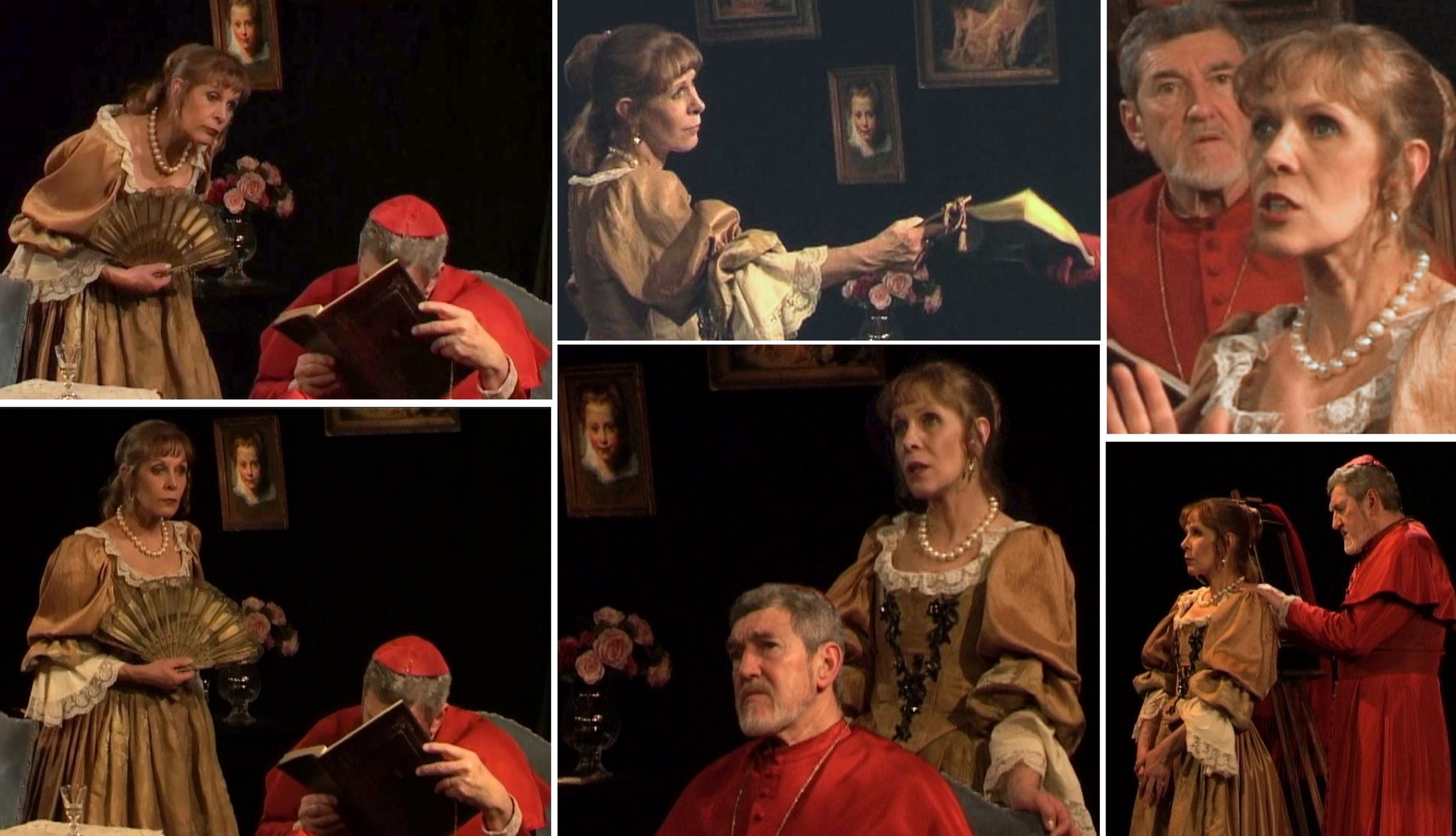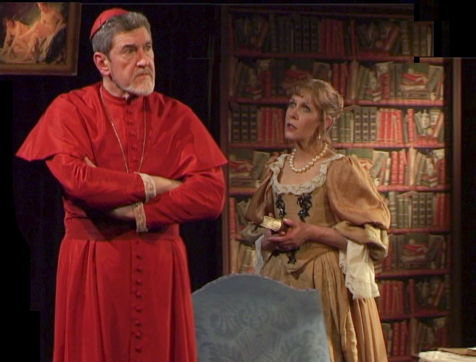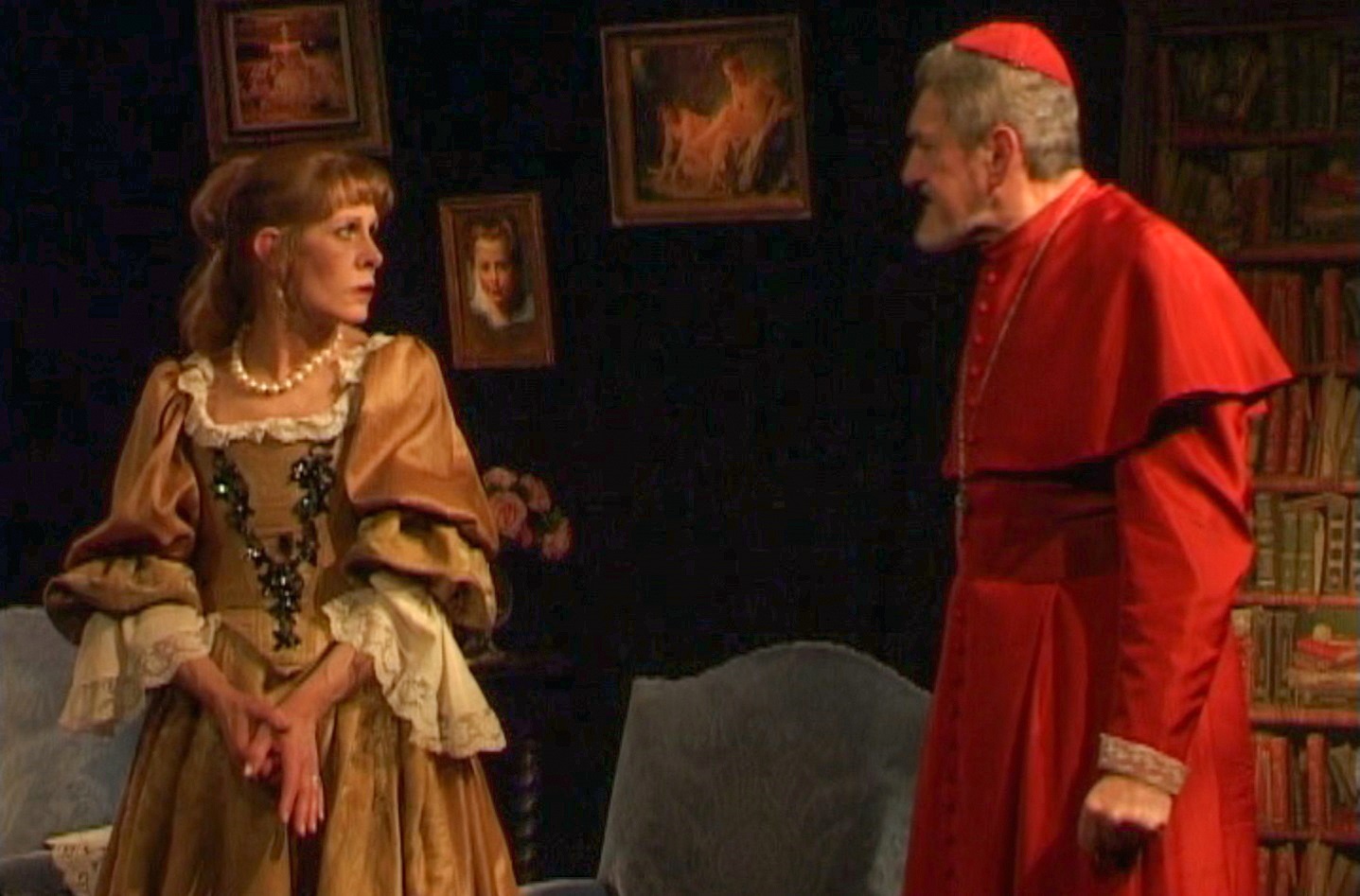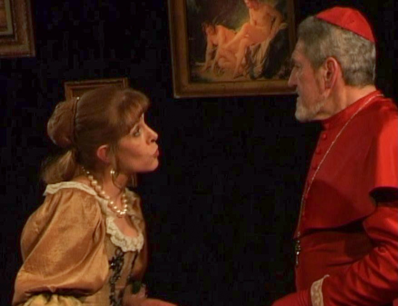 An den Fäden der schönen Frau in dem goldenen Kleid zappelt der scharlachrot gewandete Kardinal, dessen Weltbild sie voller Leidenschaft unter Tränen und Lachen aus den Fugen hebt.