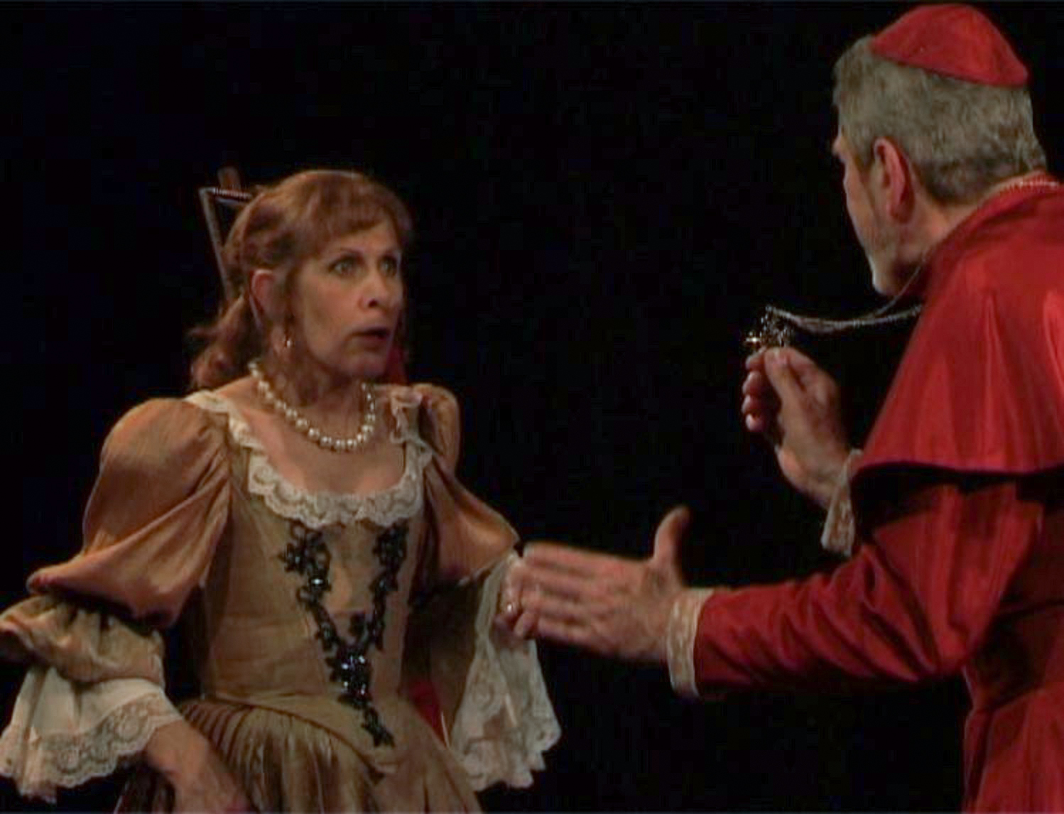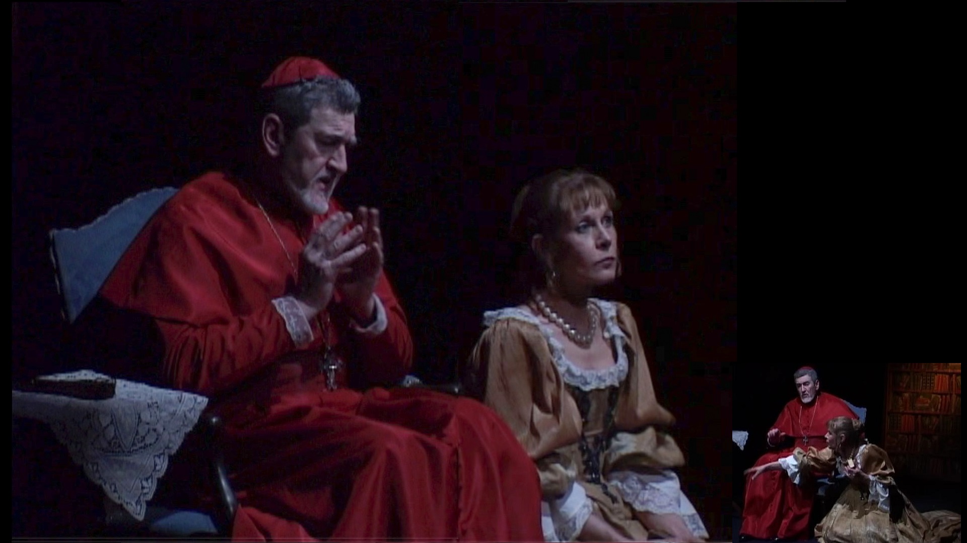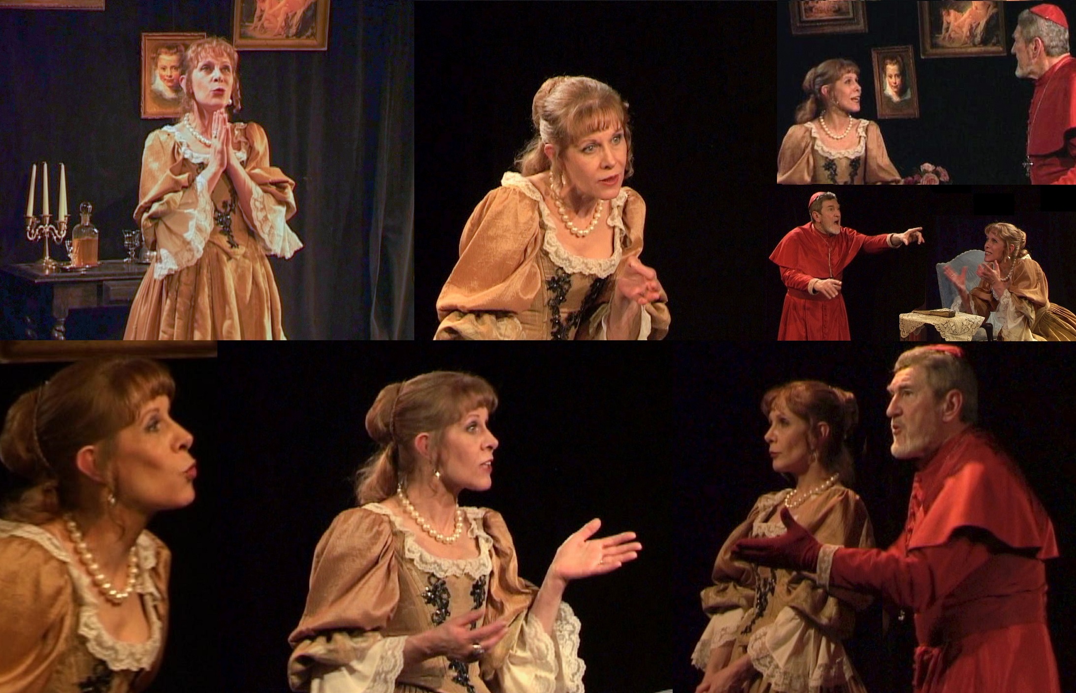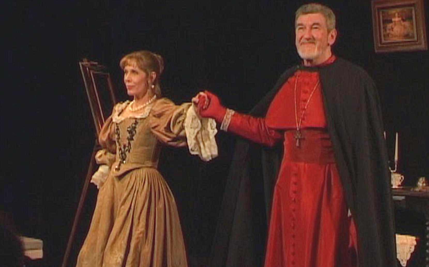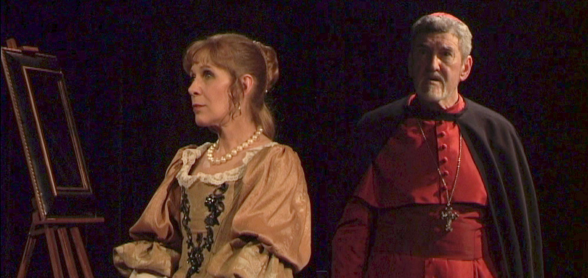 An den Fäden der schönen Frau in dem goldenen Kleid zappelt der scharlachrot gewandete Kardinal, dessen Weltbild sie voller Leidenschaft unter Tränen und Lachen aus den Fugen hebt.