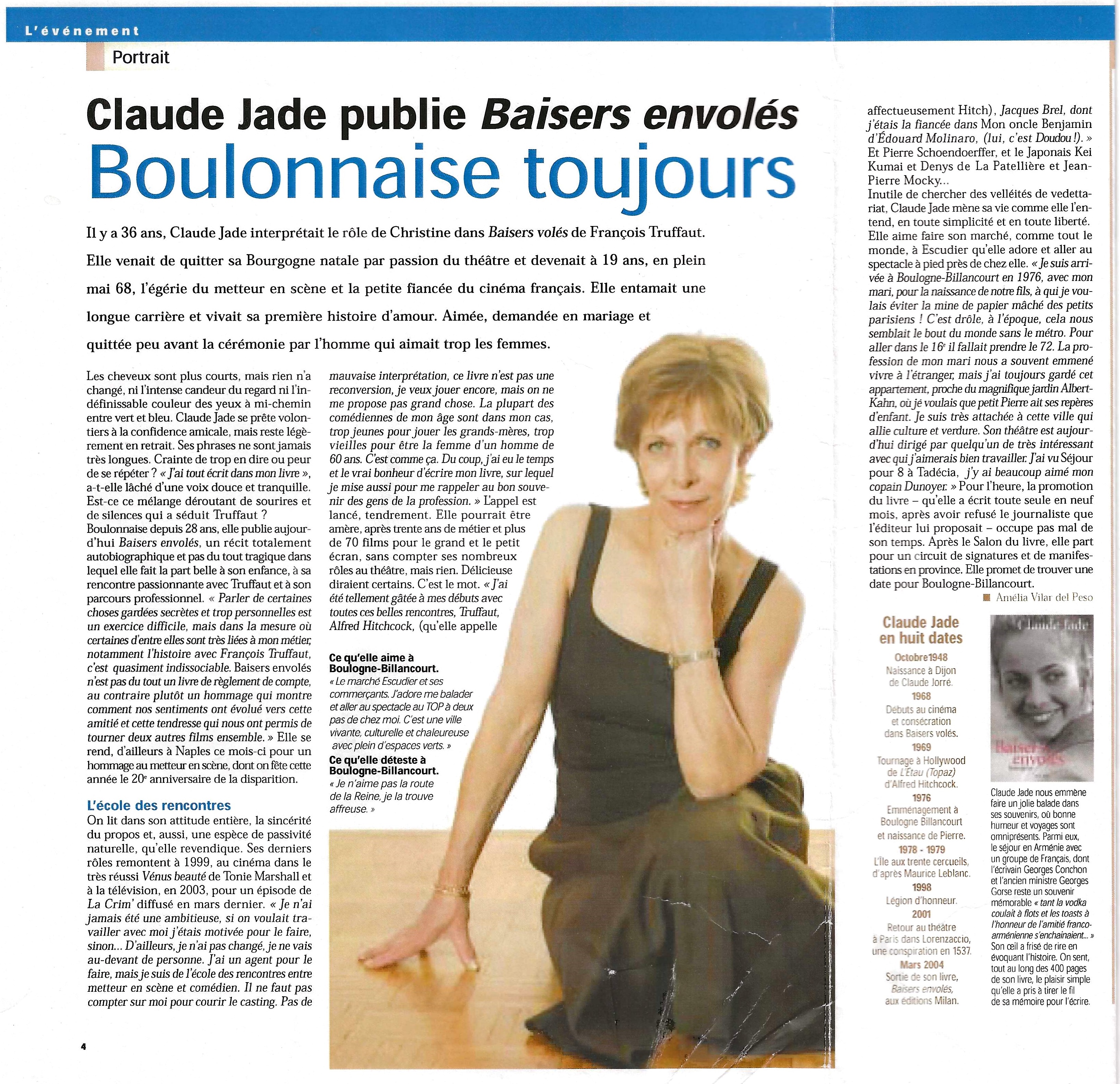 Am 5. März 2004 Erstausstrahlung von „La crim: Le secret“, im März veröffentlicht Caude Jade auch ihre Erinnerungen „Baisers envolés“