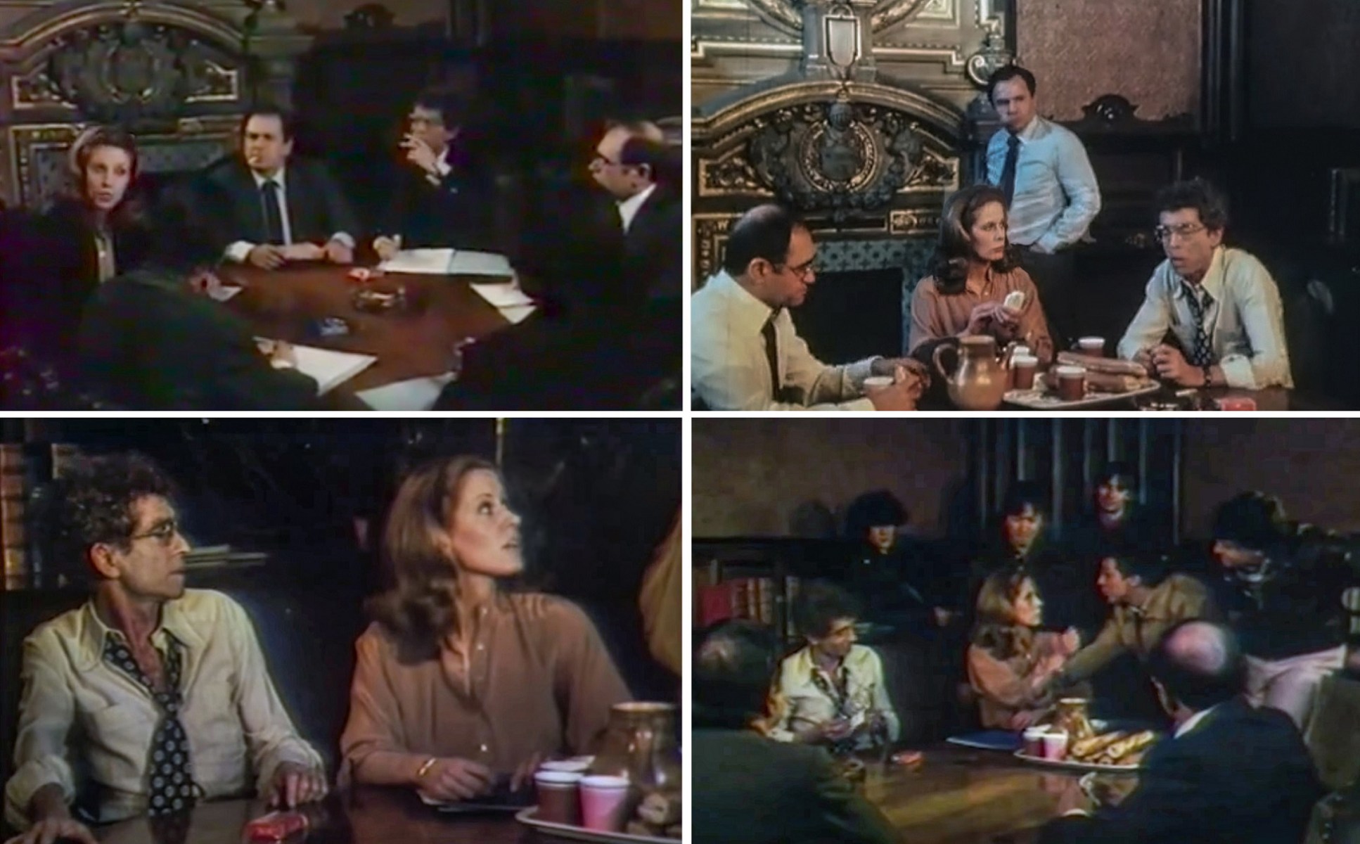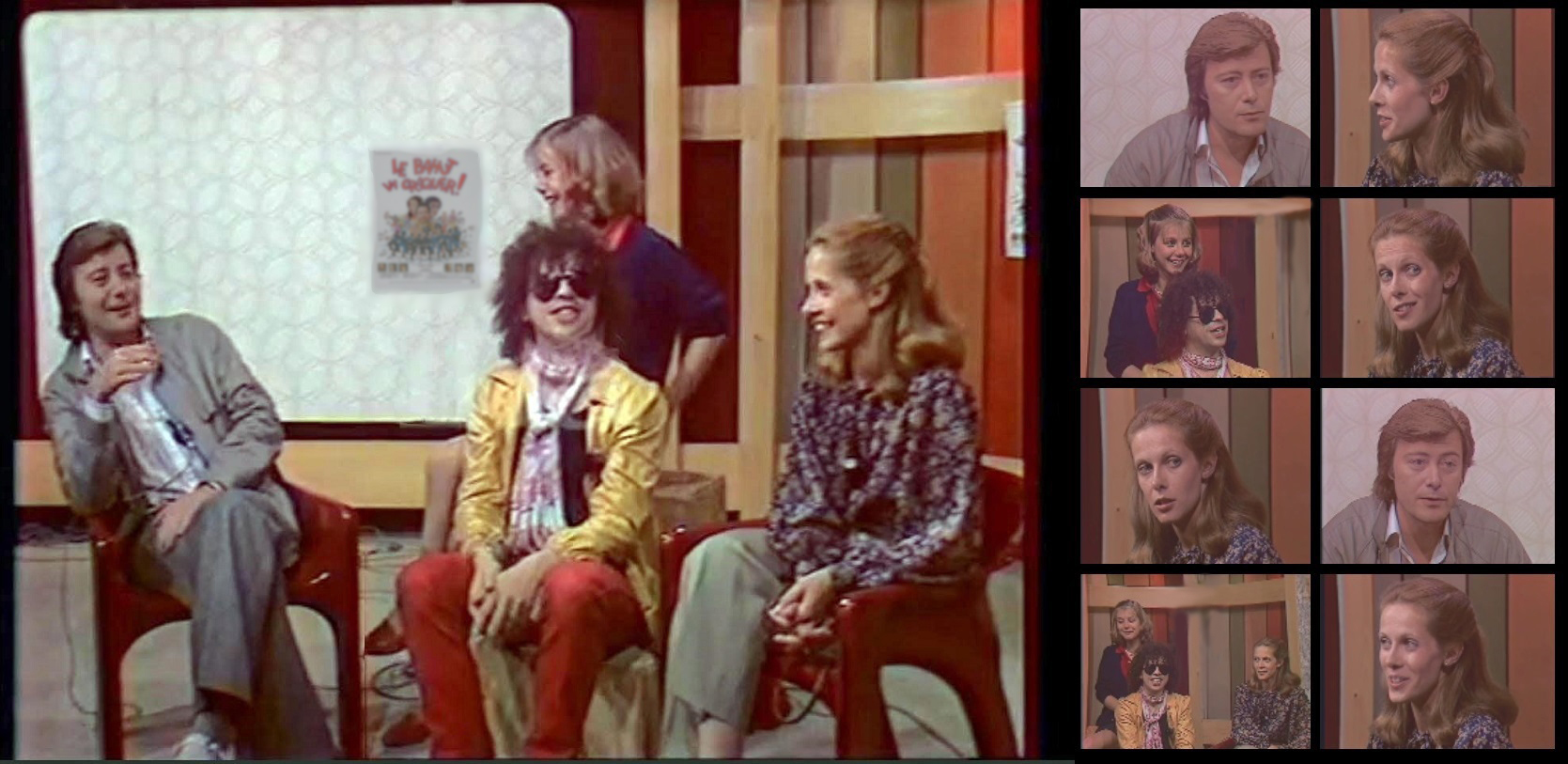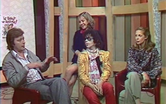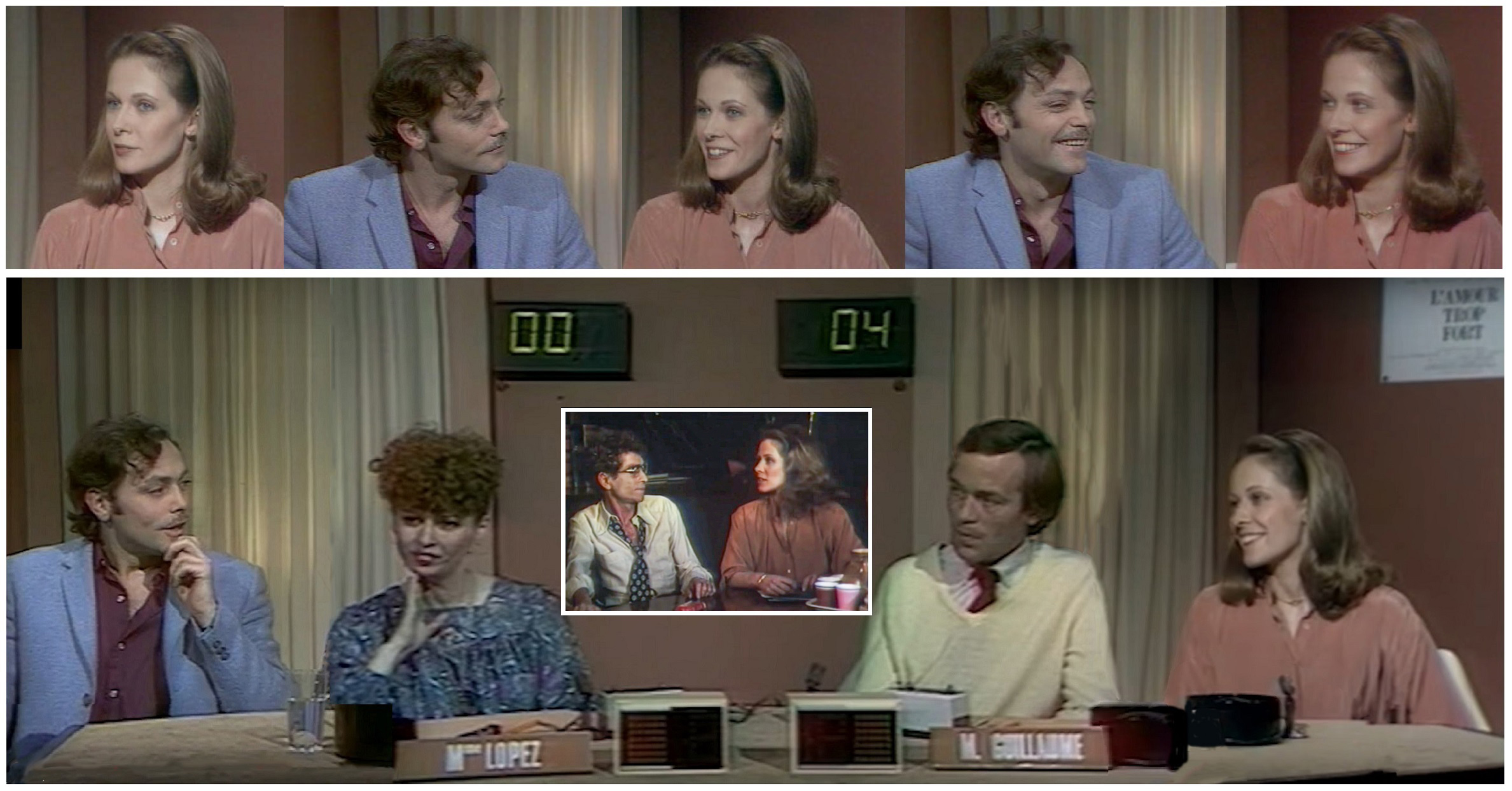 Claude Jade und Patrick Dewaere beim Quiz mit Studiokandidaten in „Jeudi Cinema“. Sie stellt „Le bahut va craquer“ vor, er „Plein sud“.