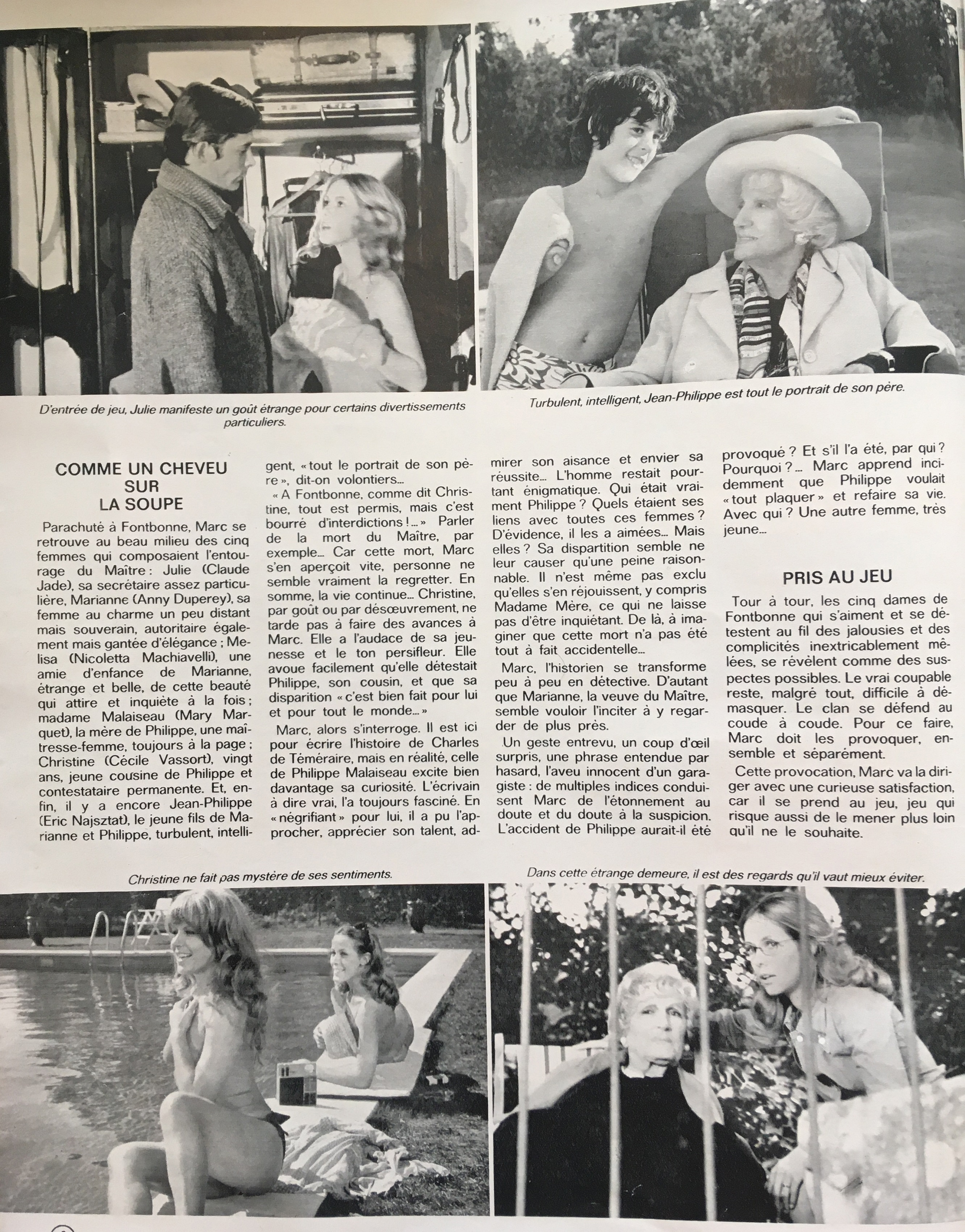 Die Schauspieler schlafen im Château d’Arpaillargues in jenen Zimmern, die auch von ihren Rollen bewohnt werden. Eine familiäre Atmosphäre entsteht so für Jacques Weber, im Kino bis dahin vor allem durch Costa-Gavras‘ „Sondertribunal“, Juan Luis Buñuels „Die Frau mit den roten Stiefeln“ und als zentraler Hauptdarsteller in Yves Boissets „R.A.S.“ bekannt, und seine populären Partnerinnen: Die rätselhafte Anny Duperey, die mit Claude in „Sous le signe de Monte Cristo“ zu sehen war, hatte nach Hauptrollen in Komödie wie Pierre Richards „Les malheurs d’Alfred“ und Jean Delannoys „Nur eine Frage der Zeit“ gerade ihren Durchbruch als Partnerin von Jean-Paul Belmondo in Alain Resnais‘ „Stavisky“. Nicoletta Machiavelli aus Luigi Zampas sarkastischer Komödie „Eine Frage der Ehre“ war ein Star des Italo-Western. Die rotblonde Cécile Vassort war seit Claude Gorettas „Die Einladung“ eine Nachwuchshoffnung und war als Jean Gabins Filmtochter, die sich in „Zwei Männer in der Stadt“ in Alain Delon verliebt, bekannt.