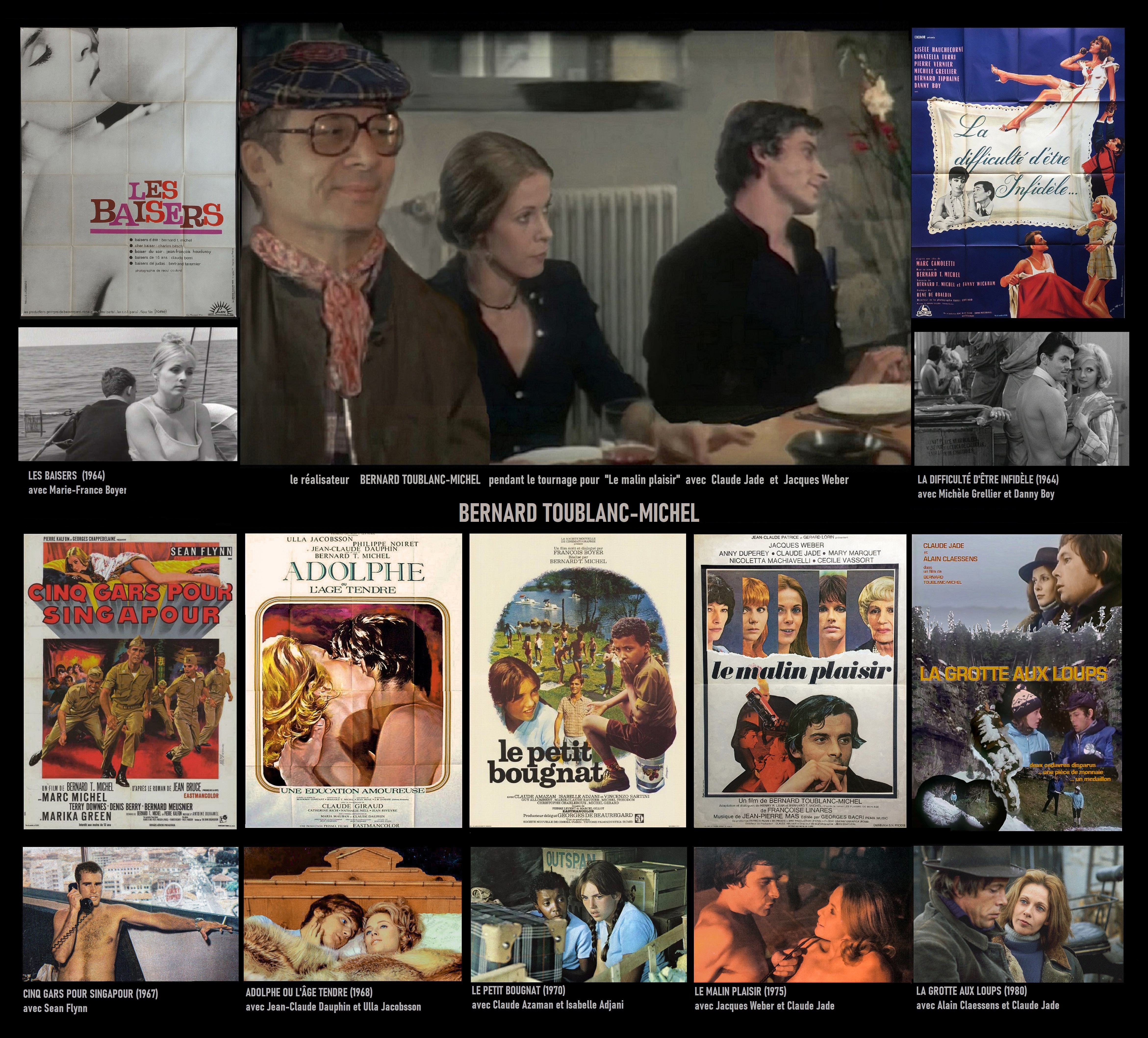 Bernard Toublanc-Michel und seine Filme „Les Baisers“ (Sketch „Baiser d’été“ mit Marie-France Boyer), „La difficulté d’être infidele“ mit Michèle Grellier, Danny Boy, Pierre Vernier, „Cinq gars pour Singapour“ mit Sean Flynn, „Adolphe ou l’âge tendre“ mit Jean-Claude Dauphin und Ulla Jacobsson, „Le petit Bougnat“ mit Claude Amazan und Isabelle Adjani, „Le malin plaisir“ mit Jacques Weber und Claude Jade, „La grotte aux loups“ mit Claude Jade und Alain Claessens.