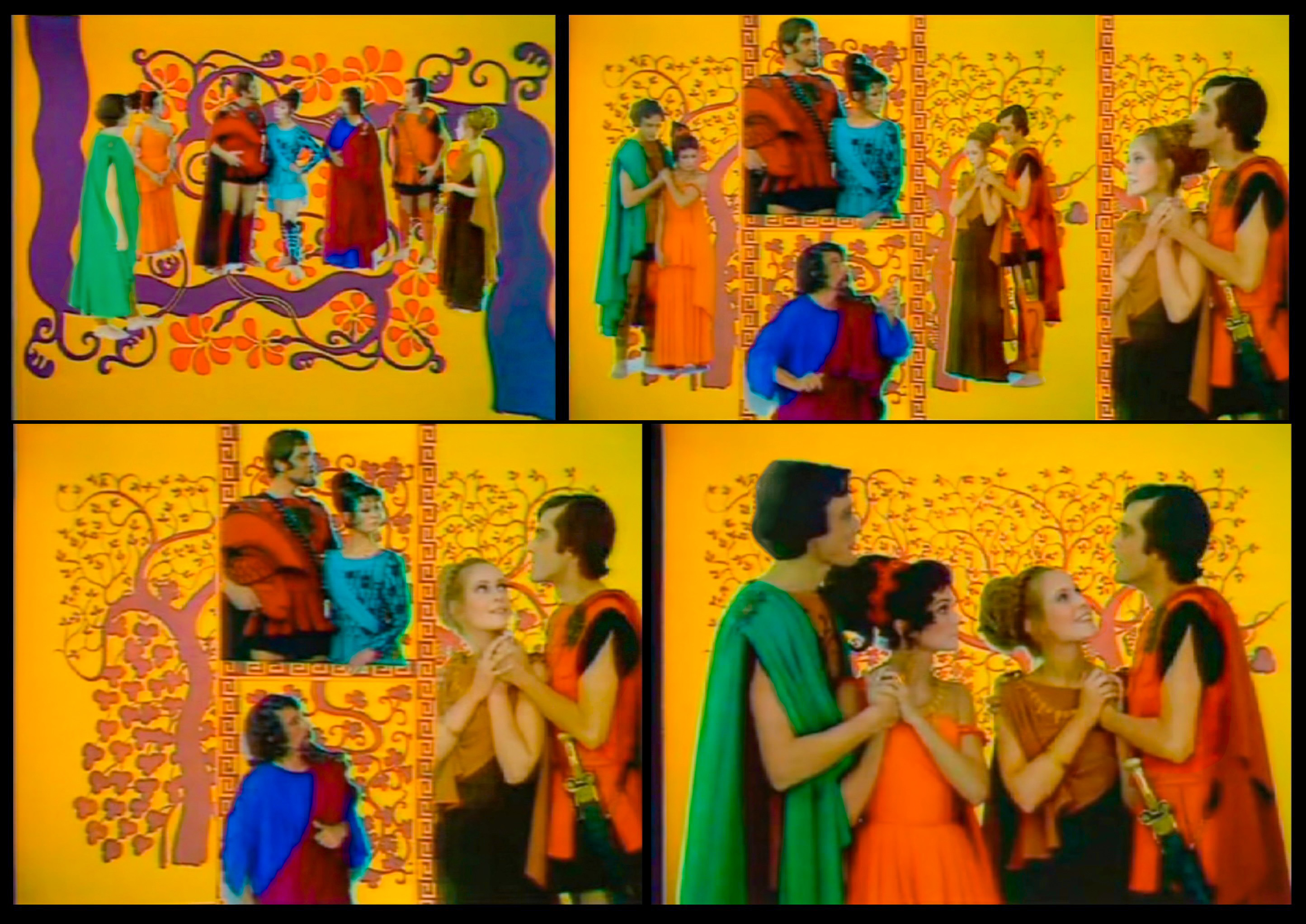 Für Claude Jade bietet sich eine irreal anmutende Erfahrung, in einem nackten Raum mit blauen Wänden, mit blauen Tonnen, Klötzen und Säulen zu agieren, der später zu Shakespeares Märchenwald wird. Das Bild teilt sich per Split-screen in parallele Szenen, schwelgend vor einem psychedelischen Farbenmeer, das machmal so flirrend erscheint, dass zwar die Atmosphäre unterstützt wird, die Schauspieler in einigen Einstellungen von diesem Universum fast verschlungen werden.