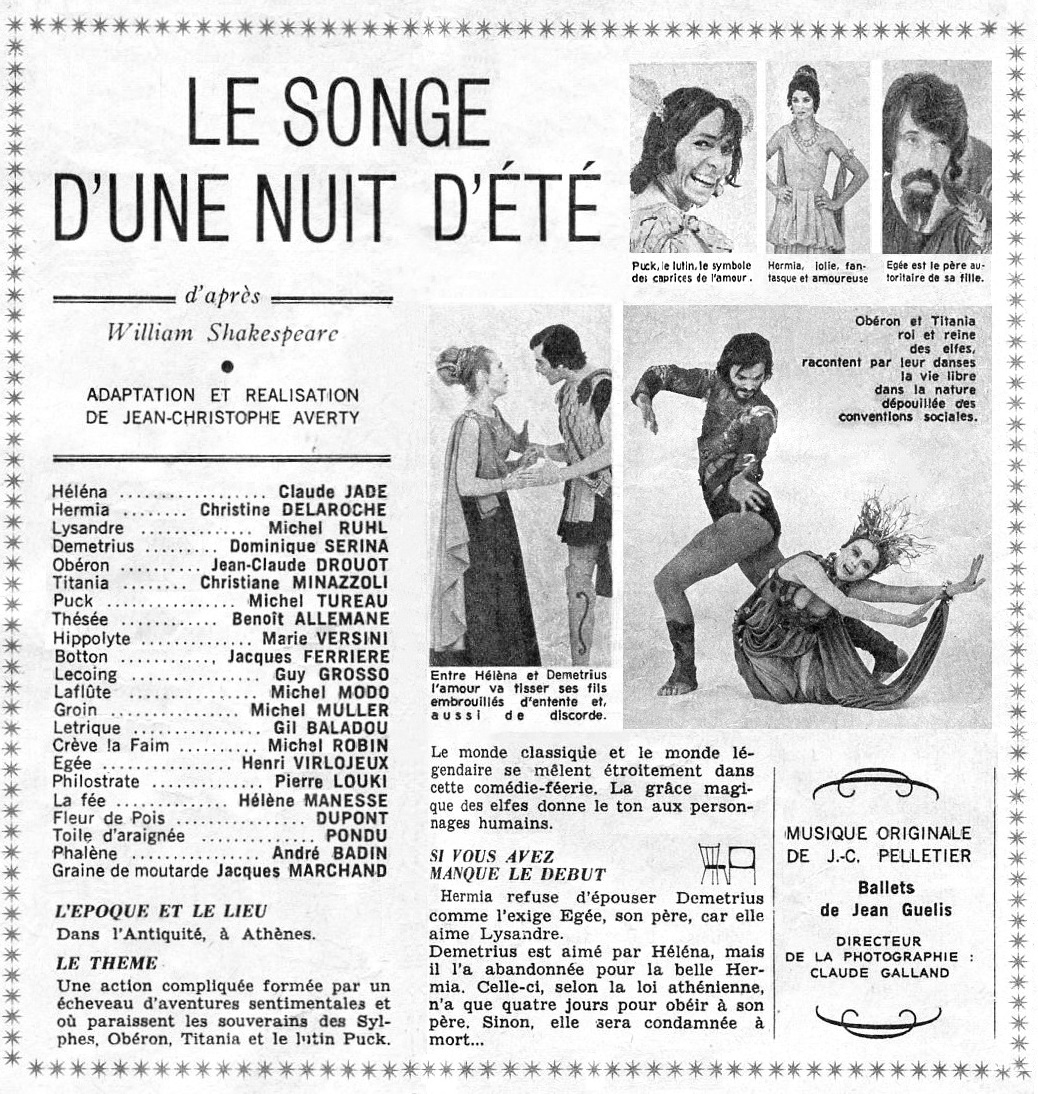 Ein Jahr zuvor hatte Peter Hall mit Schauspielern der Royal Shakespeare-Company den „Sommernachtstraum“ verfilmt und war 1969 für einen Primetime-Emmy-Award nominiert. Bei ihm agierten Größen wie Diana Rigg als Helena, Helen Mirren als Hermia, David Warner als Lysander, Michael Jayston als Demetrius, Ian Holm als Puck sowie Judi Dench und Ian Richardson als Elfenkönigspaar. Emmy-Preisträger Averty konnte ebenfalls Stars gewinnen. Neben Claude Jade als Helena agieren Christine Delaroche als Helenas Freundin und Rivalin Hermia, Jean-Claude Drouot und Christiane Minazzoli als Elfenpaar Oberon und Titania, Michel Tureau als Puck sowie Marie Versini, die Nscho-tschi aus „Winnetou“, als Amazonenkönigin Hippolyta vor einer „blue screen“.‘