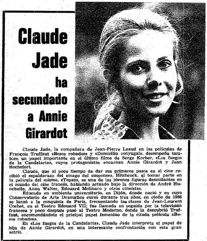 Nach einer Ausstrahlung der Fernsehsendung „Cadet Rousselle“ schreibt Maurice Clavel im Mai 1972 im „Nouvel Observateur“ über ihren Auftritt in der Show: „Der junge Star Claude Jade, deren Talent in ‚Sheherazade’ ich hier kürzlich gespriesen habe, antwortet auf die Frage nach aktuellen Projekten: ,Ich drehe gerade einen Film, dessen Hauptdarstellerin Annie Girardot ist.’ Andere würden sagen: ‚Ich drehe einen Film’, oder höchstens ‚einen Film mit Girardot’. Welch Begeisterung legt sie in eine so auserlesen bescheidene Zurückhaltung!“