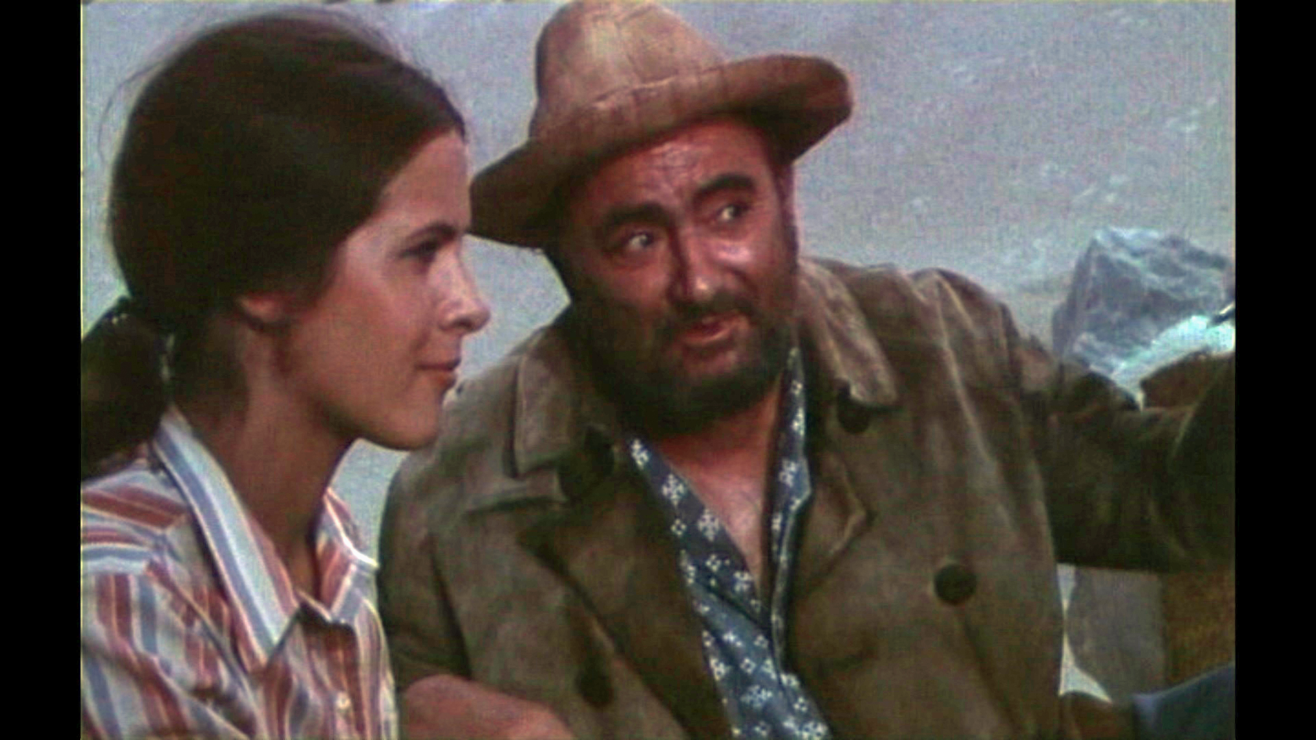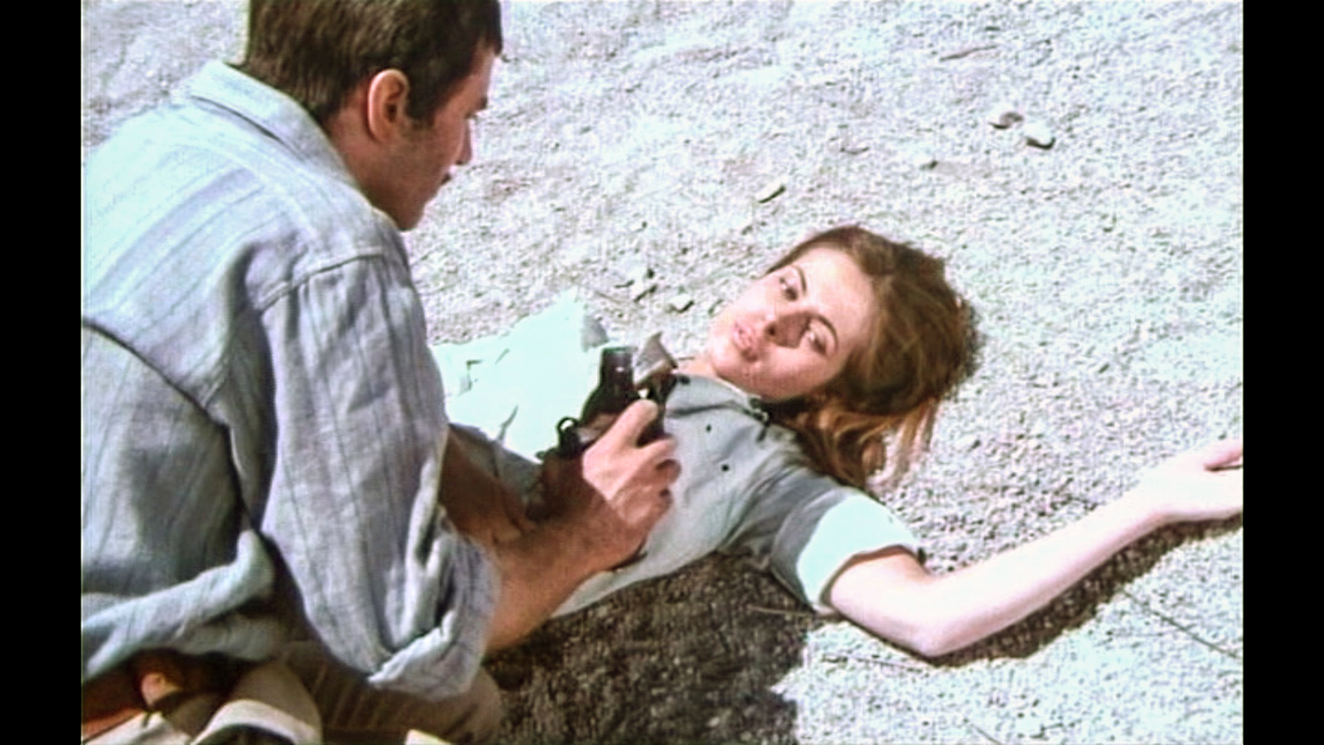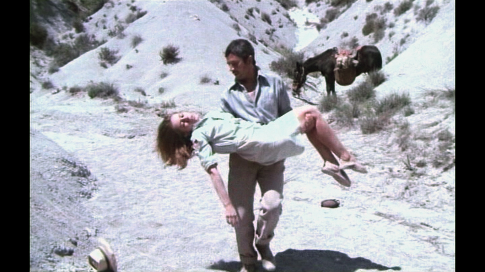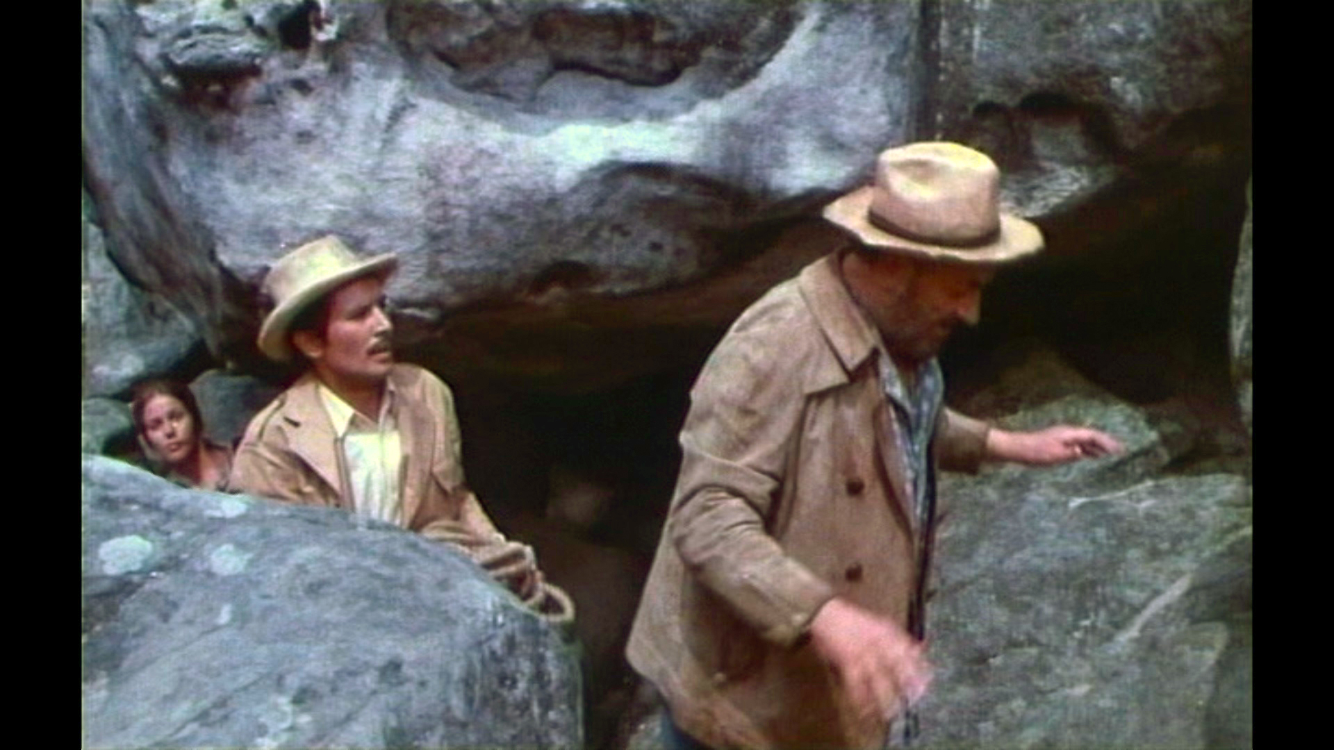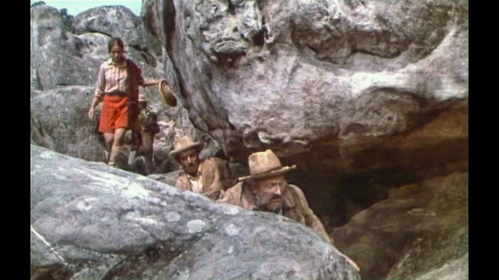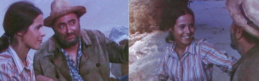 Claude Jade erscheint erst nach fast einer halben Stunde Laufzeit – ohnmächtig neben einem Maultier auf weißem Sand liegend, wird sie in karger Felslandschaft vom tapferen Helden entdeckt. Als ihre Lippen vom Wasser aus einer Feldflasche benetzt werden, öffnet sie die Augen, wird von Paul Barge hochgehoben und in Sicherheit getragen, eben so wie ein gerettetes Mädchen im klassischen Abenteuerfilm vom Helden auf dessen Heldenarmen getragen wird.