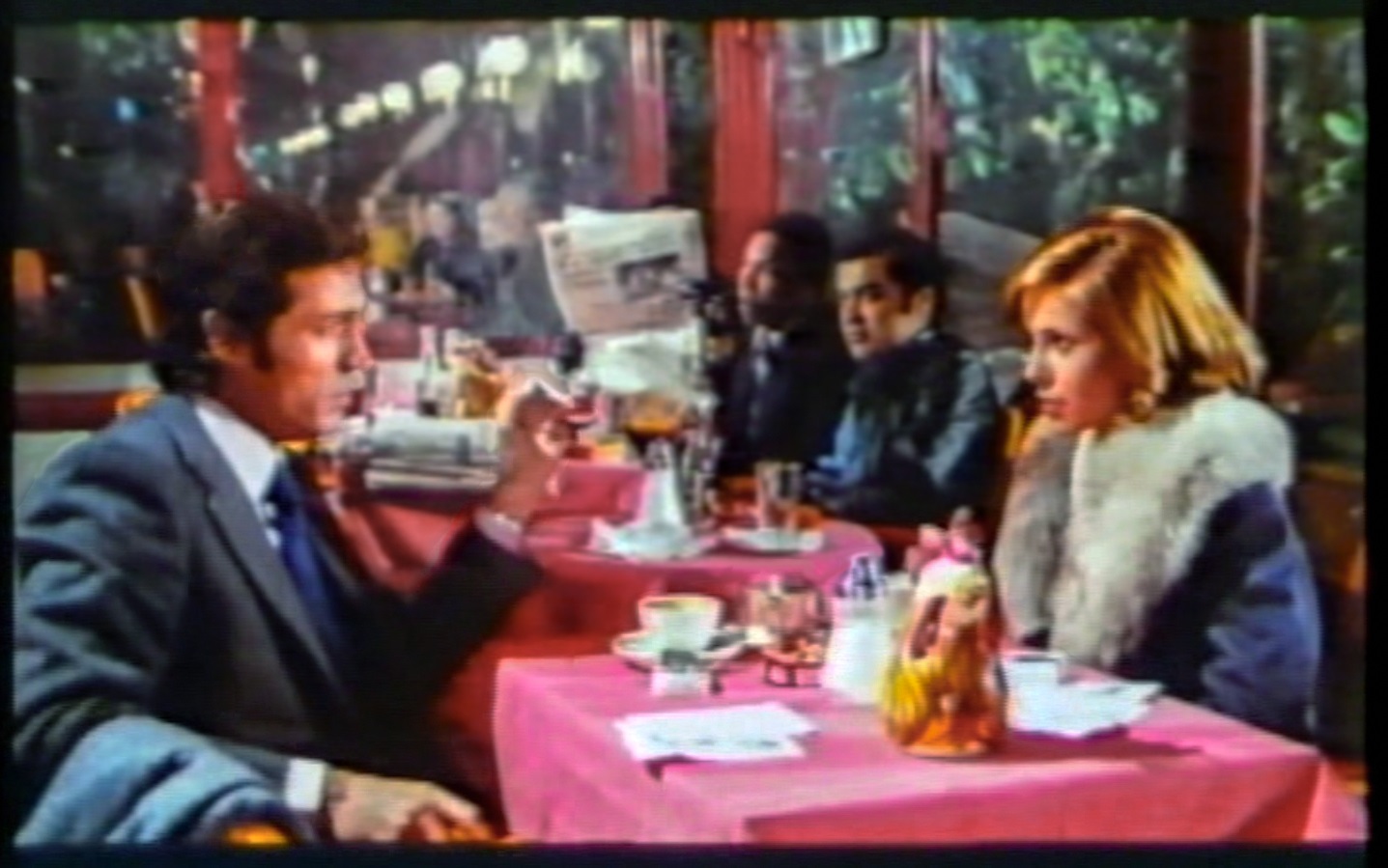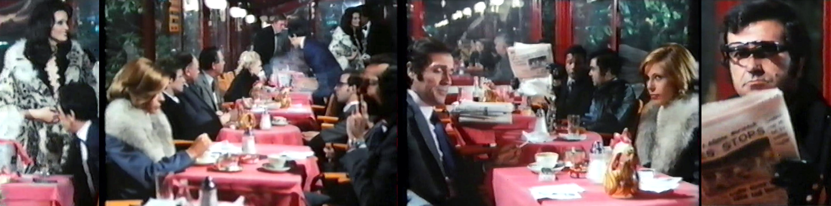 Während Sandro und Tiffany im Restaurant Laura (Femi Benussi) observieren, hat ein Killer (hinter der Zeitung: Antonio Basile) Sandro im Blick.