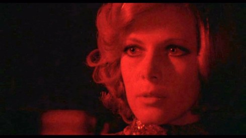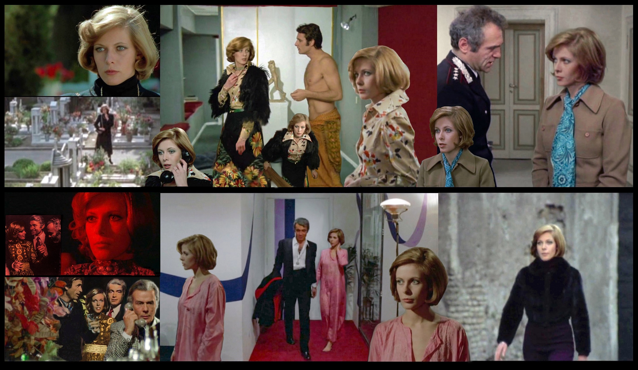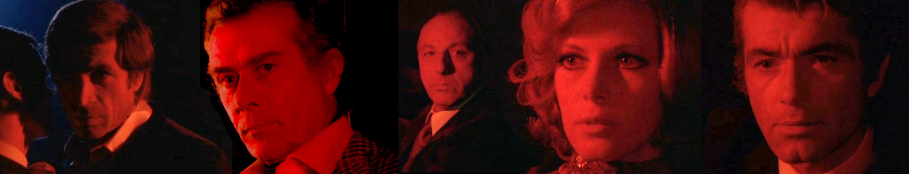 Die in Rotlicht gezeigte Stimmung ist bei diesen Figuren angespannt und lauernd. Sie stehen im Kontrast zu den Gästen, die sich unter der Instrumentalversion von Stevie Wonders „Superstition“ dem Rausch hingeben: zwei knutschende Frauen, ein Pärchen, das sich Kokain zustecken lässt und Callgirls, unter ihnen als Edelkomparsin die 19jährige Eleonora Giorgi kurz vor ihrer ersten Hauptrolle in der Erotikschmonzette „Der Nonnenspiegel“. Hier schmiegt sie sich giggelnd an den Commenda und in einer späteren Rückblende an ein Opfer, den Onkel des Prinzen Rudy. Die vierminütige Szene zur Einführung der wichtigsten Charaktere endet mit einer Großaufnahme von Claude Jade.