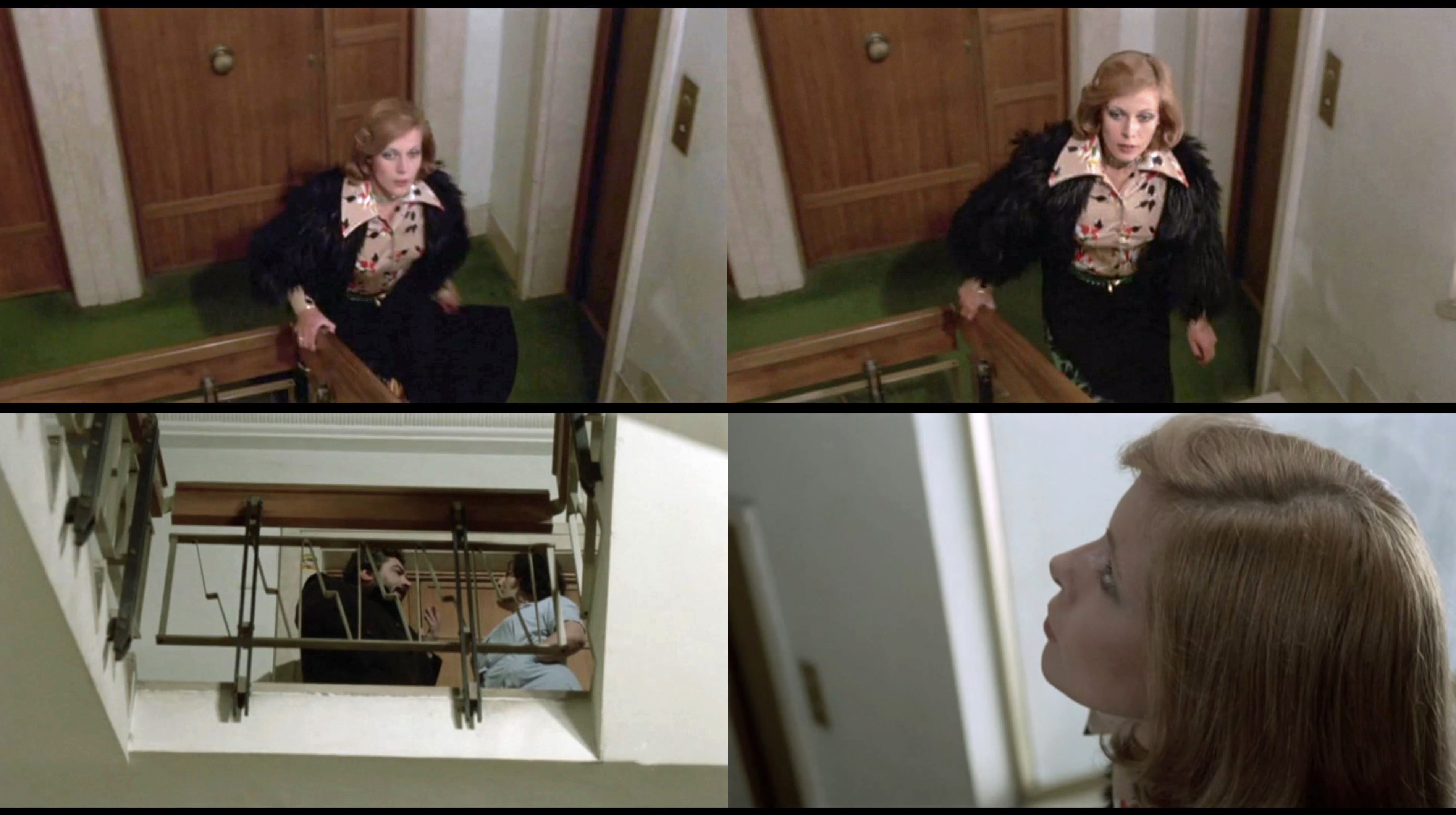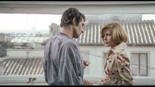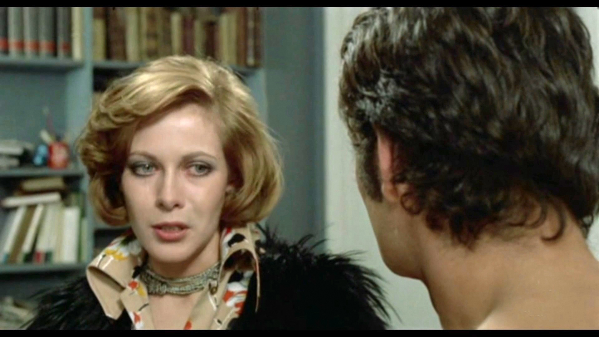 Sylvie (Claude Jade) sieht Kommissar Vinci (Renzo Montagnani), der ihre Nachbarin über sie ausfragt.