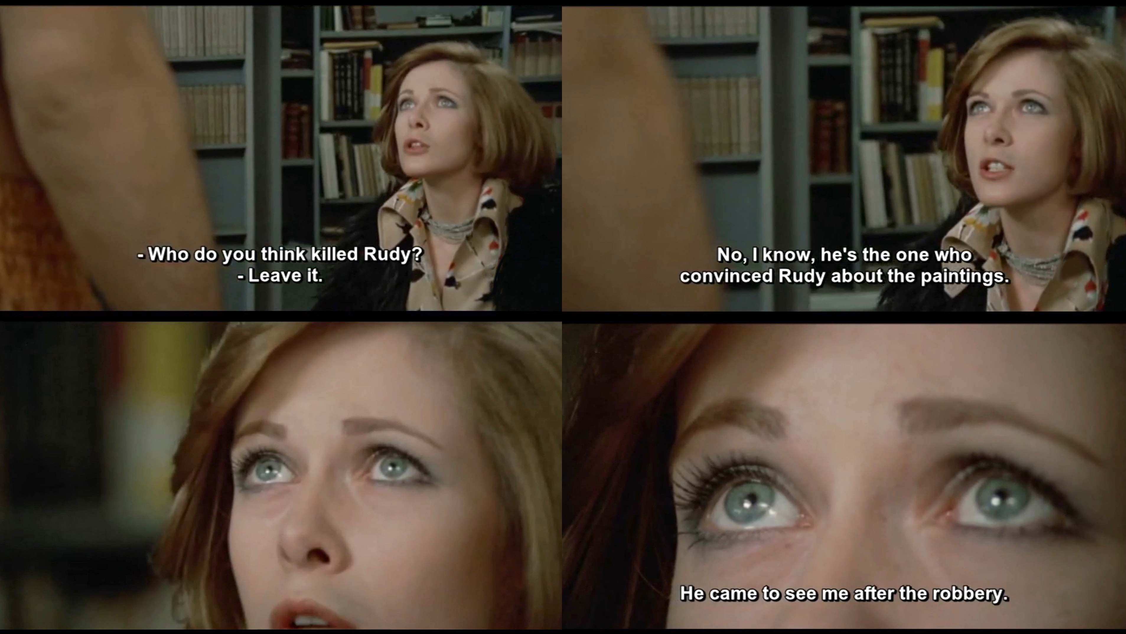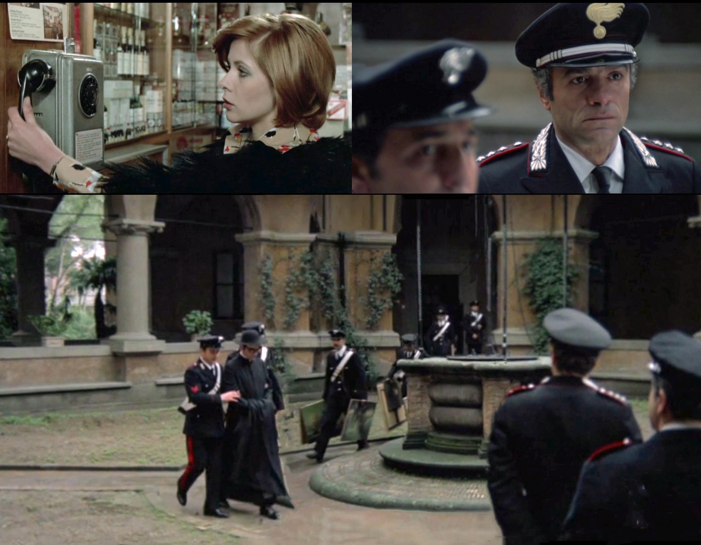 Aus einer Bar ruft gerade jene Sylvie bei den Karabinieri an und macht in einer stammelnden Mischung aus Französisch und Italienisch eine anonyme Anzeige. Sie wisse den Ort, an dem die Gemälde aus einem kürzlichen Kunstraub zu finden sei. Weitere Angaben wolle sie nicht machen und nennt das Kloster Convento di Monte Renzo, bevor sie auflegt und die Bar verlässt. Die italienische Synchronstimme von Claude Jade mutet leider etwas komisch an.